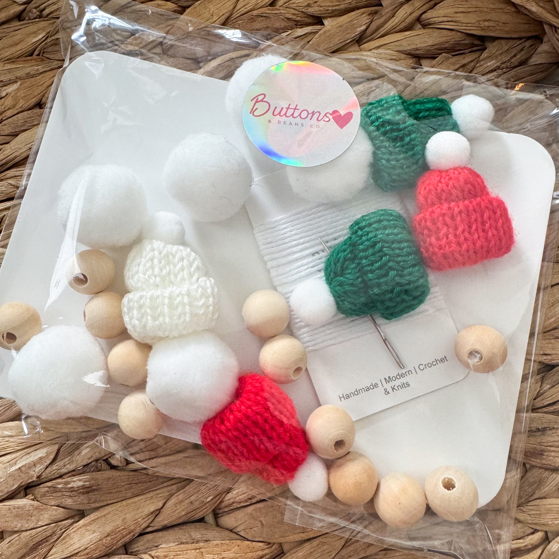 This is a DIY Kit to assemble your own mini toque garland. Includes hats, beads, string and needle.
