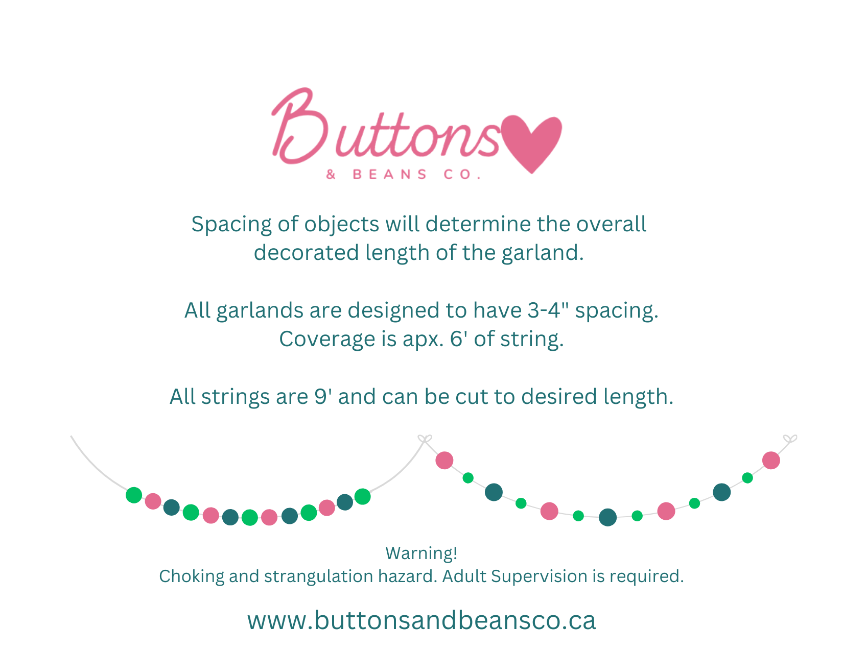 Beads and embellishments are intended to be spaced by 3-4” depending on the design and will cover approximately 6’ of space. Items can be spaced closer or further apart depending on your needs.