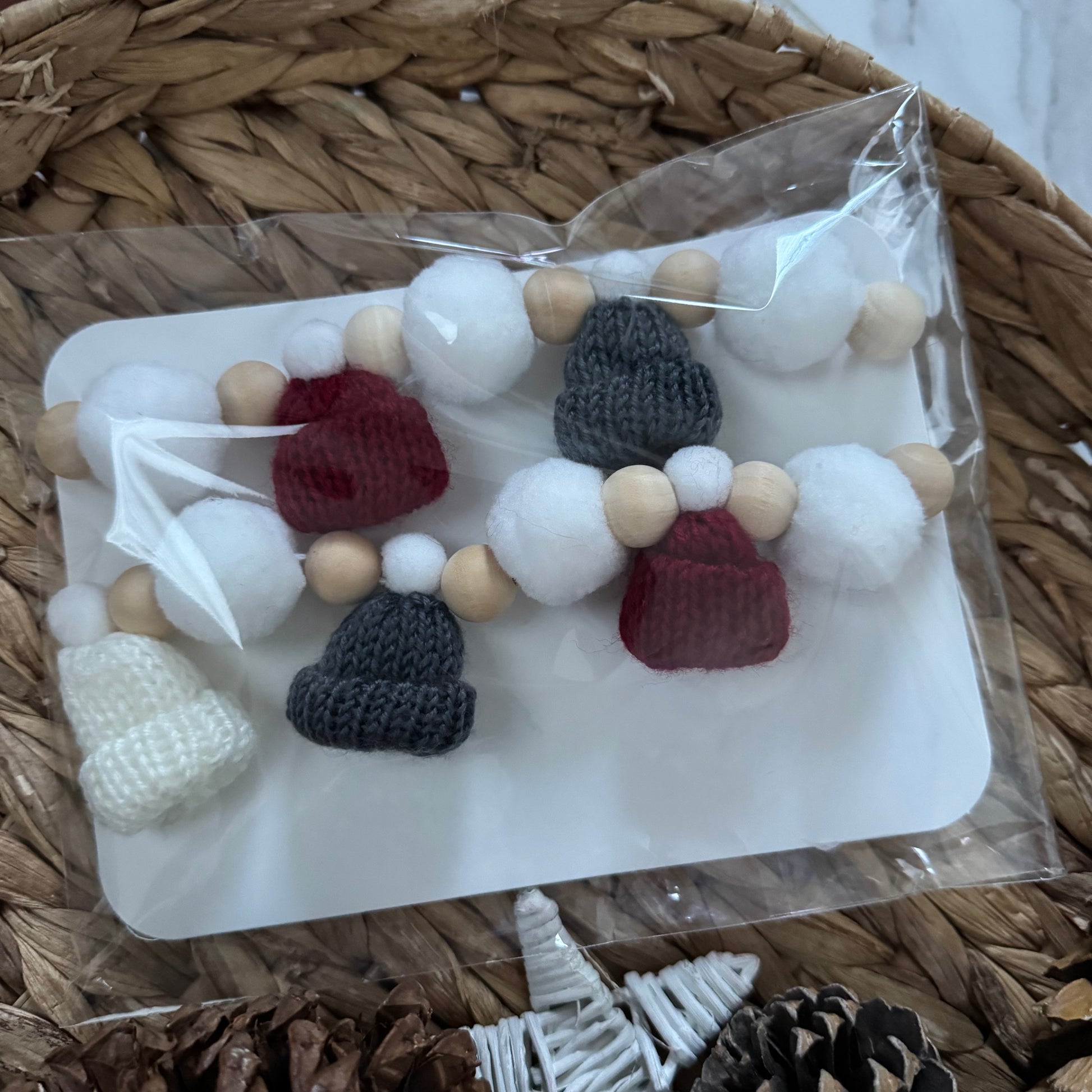 Knitted hats with Pompoms and wooden beads make the perfect addition to your seasonal decor and add a touch of warmth and personality.