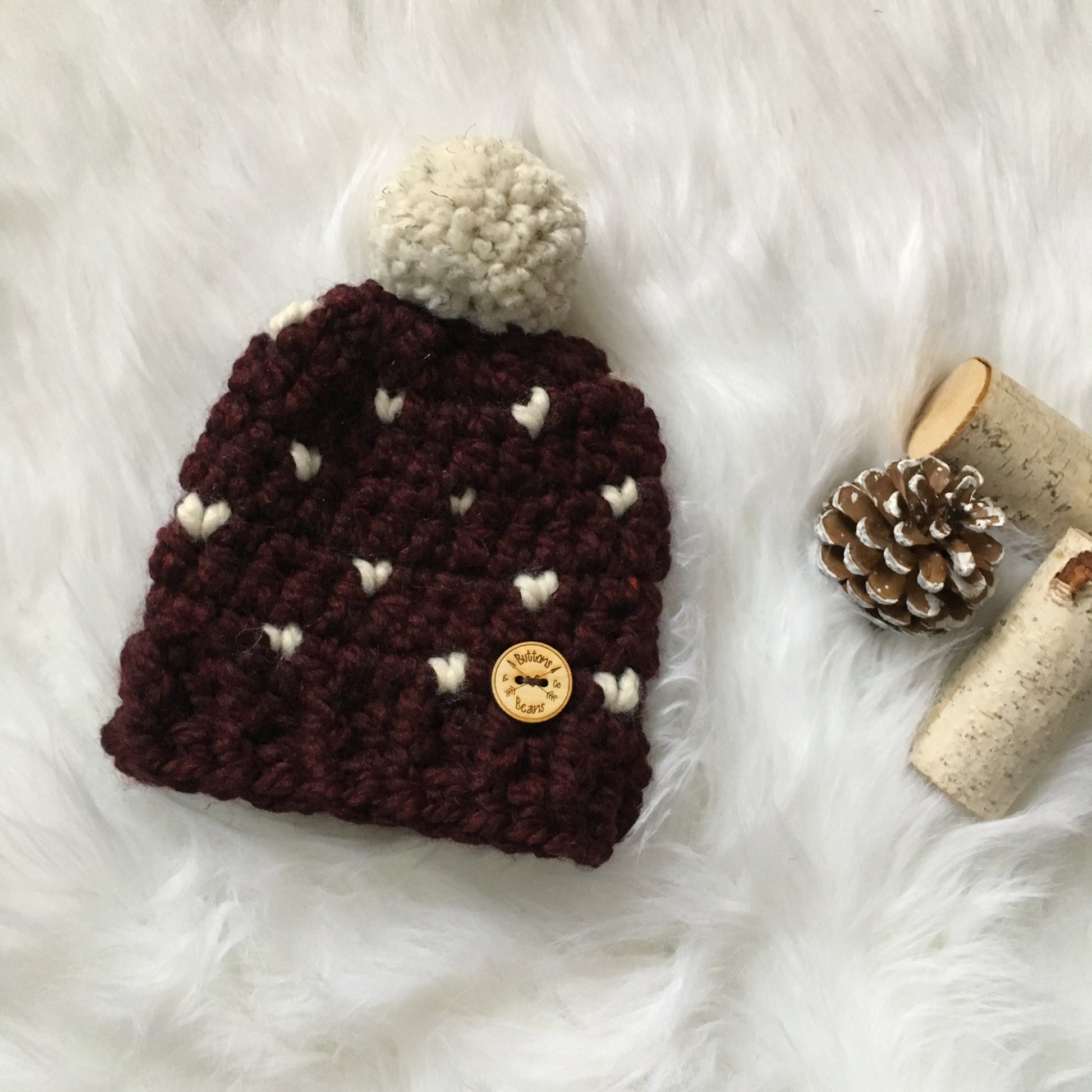 Mini Hearts | 3-6 Month Merlot Chunky Crochet Winter Hat | Removable Faux Fur Pompom